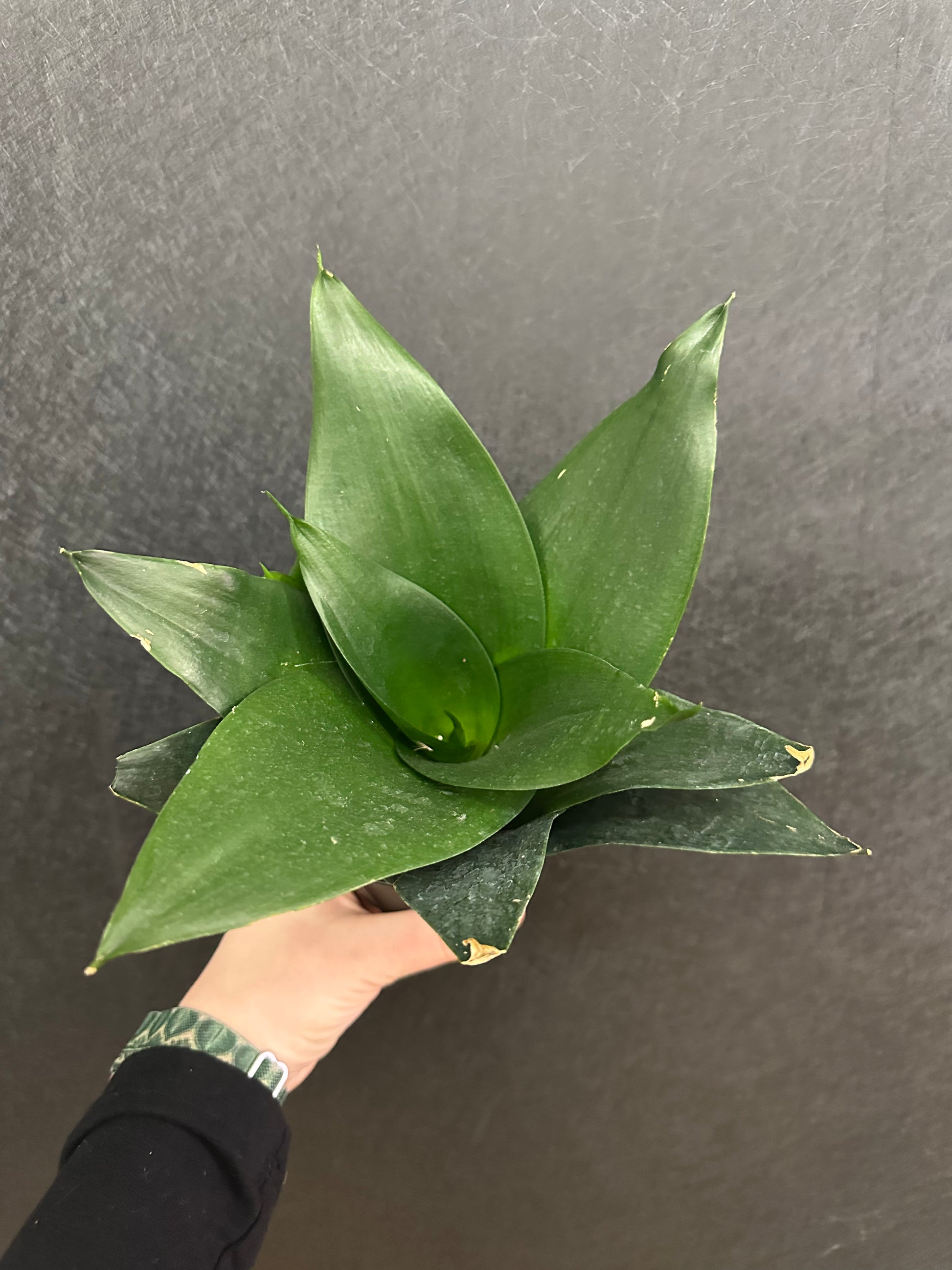 Jade Star Snake Plant is a compact, rosette-forming variety with deep green, glossy leaves arranged in a tight, upright pattern. It thrives in low to bright indirect light and requires minimal watering, preferring to dry out completely between waterings. This plant is not pet-safe, as it can be toxic if ingested. With its sturdy nature and air-purifying qualities, Jade Hahnii Snake Plant is a perfect low-maintenance addition to any space.