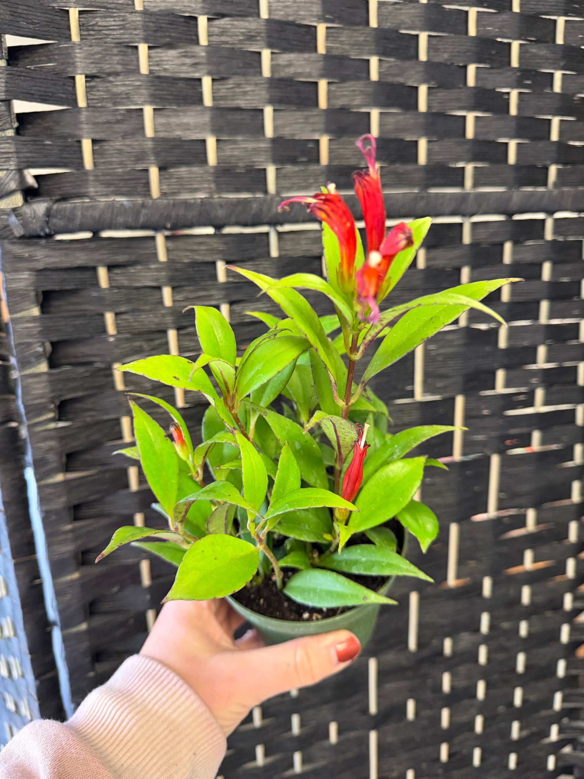 Lipstick Plant ‘Mona Lisa’ is a vibrant tropical beauty known for its glossy green leaves and bright red, tube-shaped blooms that look like lipstick emerging from a tube. This cheerful, trailing plant adds a pop of color to any space and is especially striking in hanging baskets.