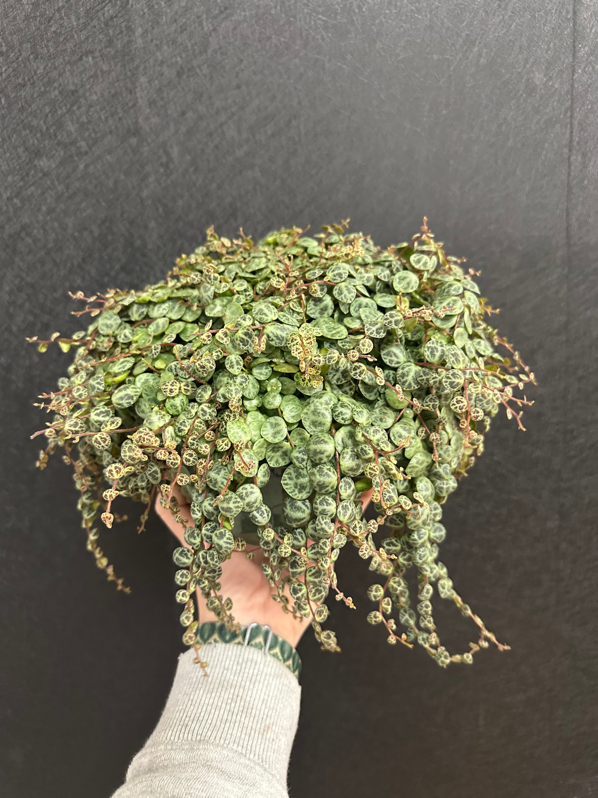 The String of Turtles (Peperomia prostrata) is a charming trailing plant with small, round leaves patterned like tiny turtle shells. Perfect for hanging baskets or shelf displays, this slow-growing beauty brings a unique touch to any indoor garden.